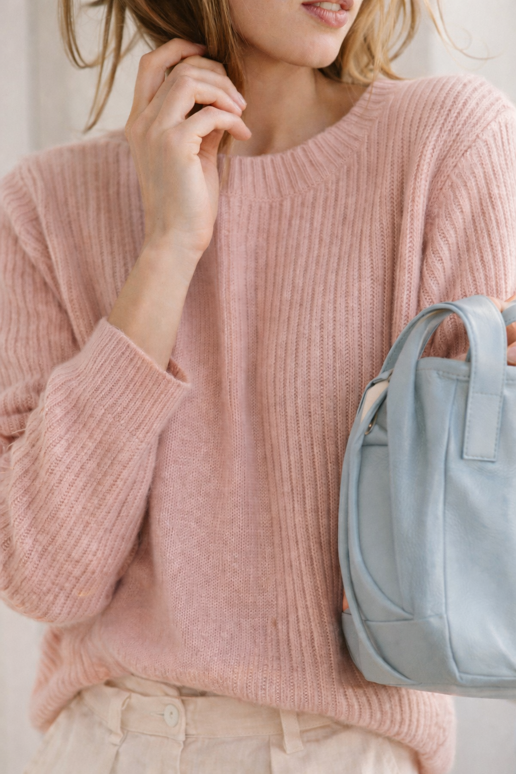 Accanto ai toni naturali emergono colori freschi e luminosi: bianco burro, rosa petalo, celeste polvere e verde pistacchio.